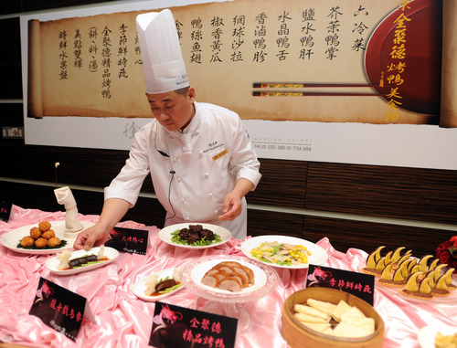 Bi Quansheng, a leading Beijing Roast Duck chef with the Quanjude Group, presents a full range of table dishes on Olympics Banquet on June 29, 2009, in Taipei, southeast China's Taiwan. (Xinhua/Wu Ching-teng)