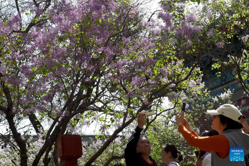 Tourists take photos of blooming lilacs at Fayuan Temple in Beijing, capital of China, April 7, 2024. (Xinhua/Luo Xiaoguang)
